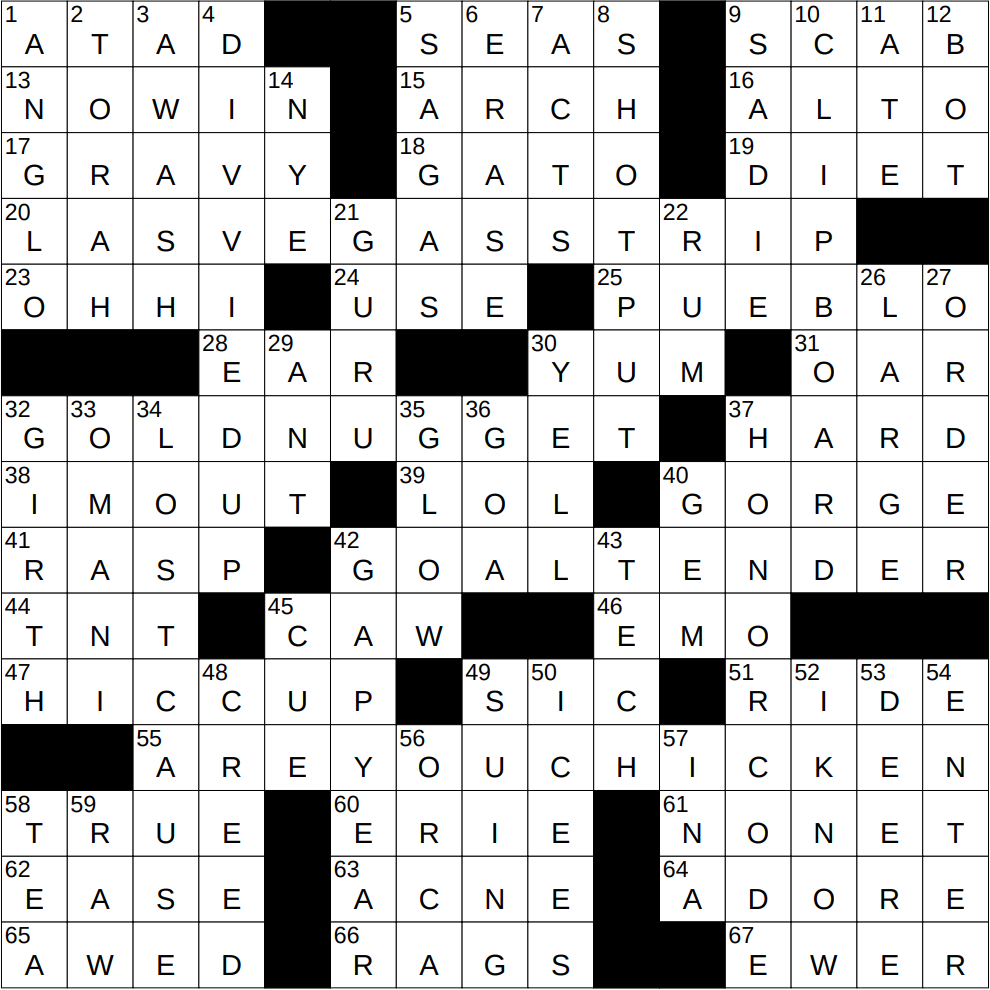 - 55A Question to a scaredy-cat … to which the final parts of 20-, 32- and 42-Across would answer “Yes!” : ARE YOU CHICKEN?