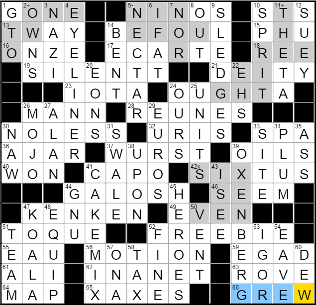 THEME: KenKen … today’s crossword is designed to evoke a KenKen puzzle. The grid includes four arithmetic symbols beside four numbers in the grid (i.e. 2÷, 5-, 11+, 42x). I’m not a KenKen solver myself, but the trick with the crossword is to apply the arithmetic operation designated to the two nearby numbers spelled out in the shaded squares, and the answer is the number beside the arithmetic symbol (i.e. the answer/clue number).