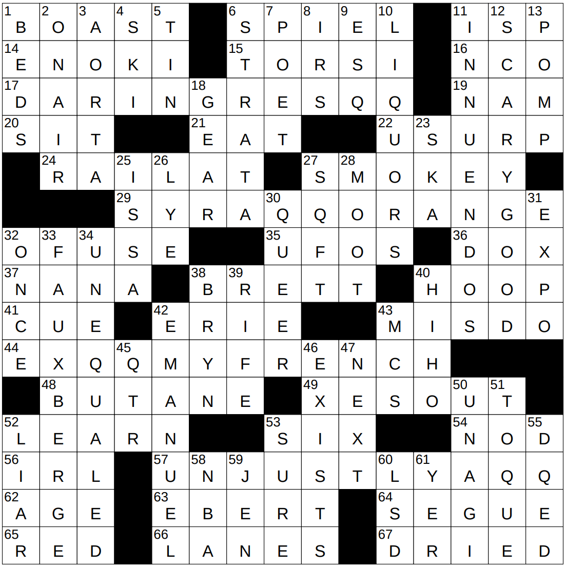 Themed answers are phrases in which a “cues” sound has been replaced by “QQ” in the grid: