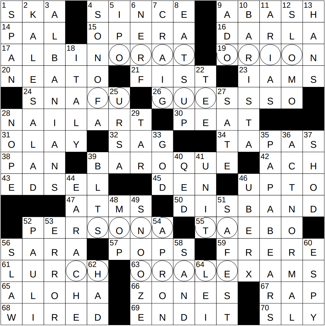 • 39A Music genre for the words hidden in this puzzle’s circled letters … or a punny description for them? : BAROQUE