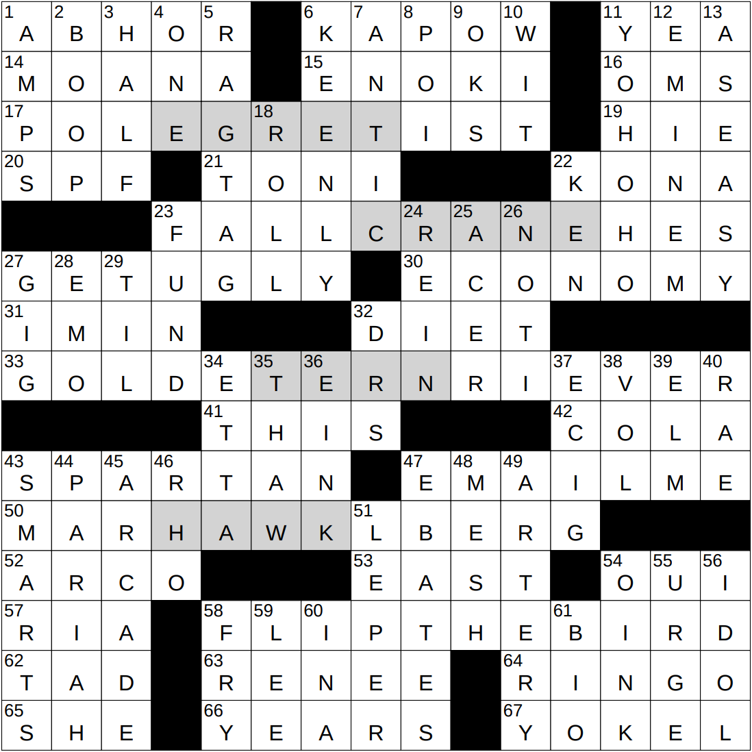 • 58A Make a rude gesture … or a hint to answering 17-, 23-, 33- and 50-Across : FLIP THE BIRD